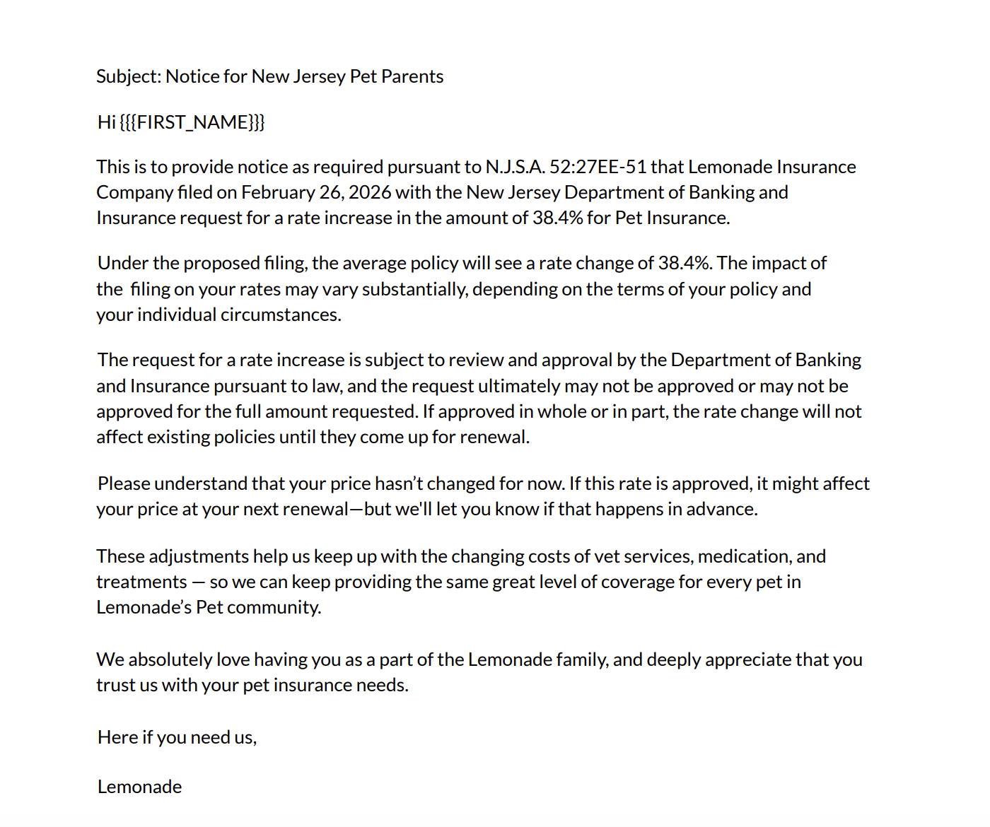 Lemonade submitted a form, rate, and rule filing in New Jersey for its pet insurance program, with changes requested to take effect September 18, 2026, for renewal business. The filing proposes a 38.4% overall rate increase, below the actuarial indication of 52.2%, affecting about 28,860 policyholders and generating approximately $9.1 million in additional premium on a $23.6 million book. Individual uncapped changes range from 5.7% to 143.5%.