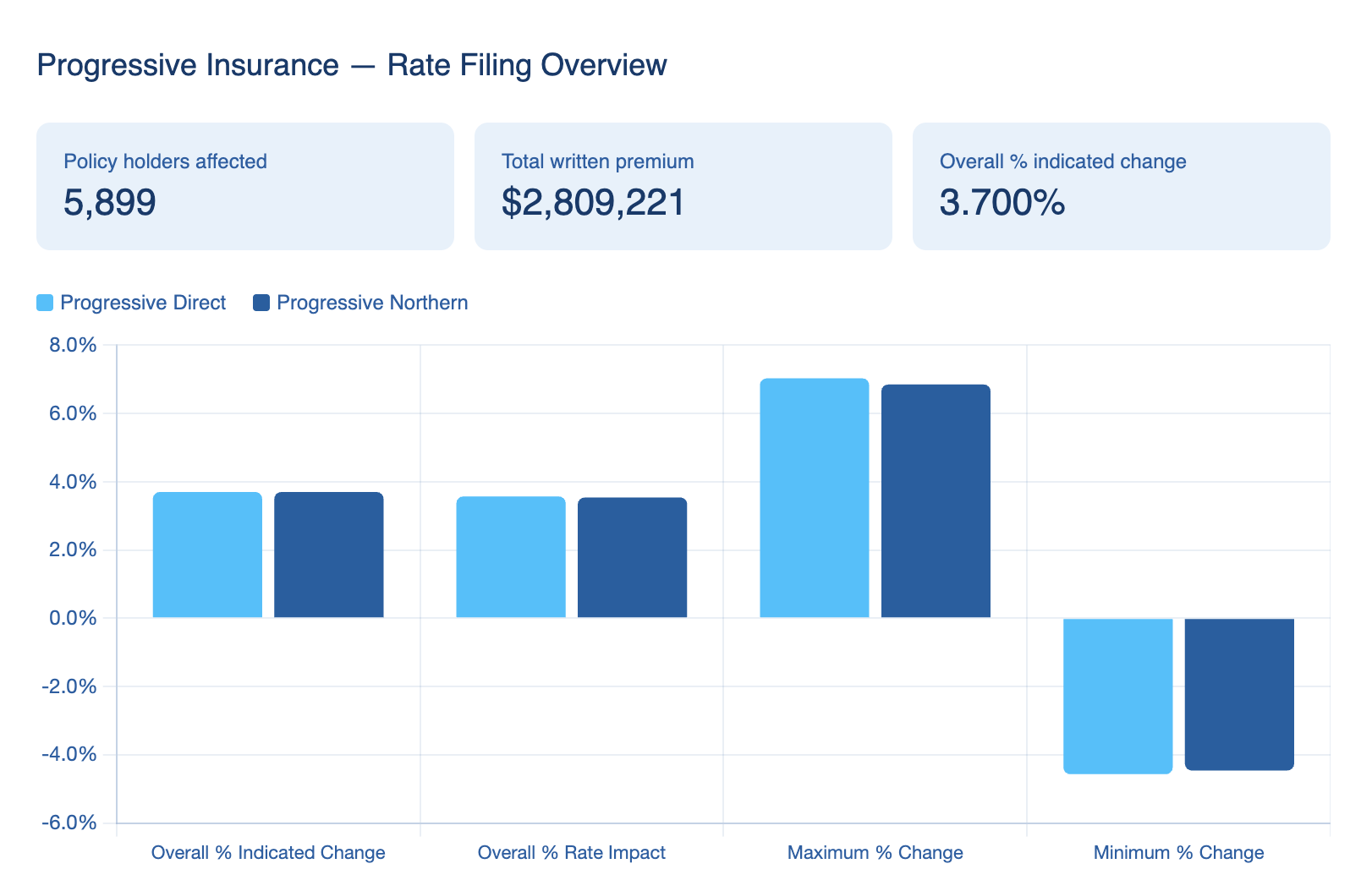The impact varies slightly by entity. Progressive Direct reflects a +3.57% rate impact across approximately 3,333 policyholders and $1.62 million in written premium, while Progressive Northern shows a +3.54% impact across 2,566 policyholders and $1.19 million in premium.