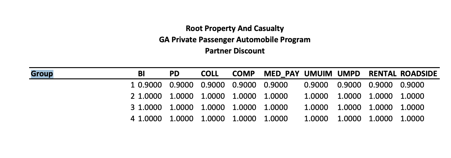 In practice, only Group 1—automobile OEM partners—receives a price benefit. That group carries a 0.90 factor across all major coverages (BI, PD, collision, comprehensive, medical payments, UM/UIM, rental, and roadside), translating to a 10% discount. The remaining groups are neutral, with factors set at 1.00, meaning no pricing impact.