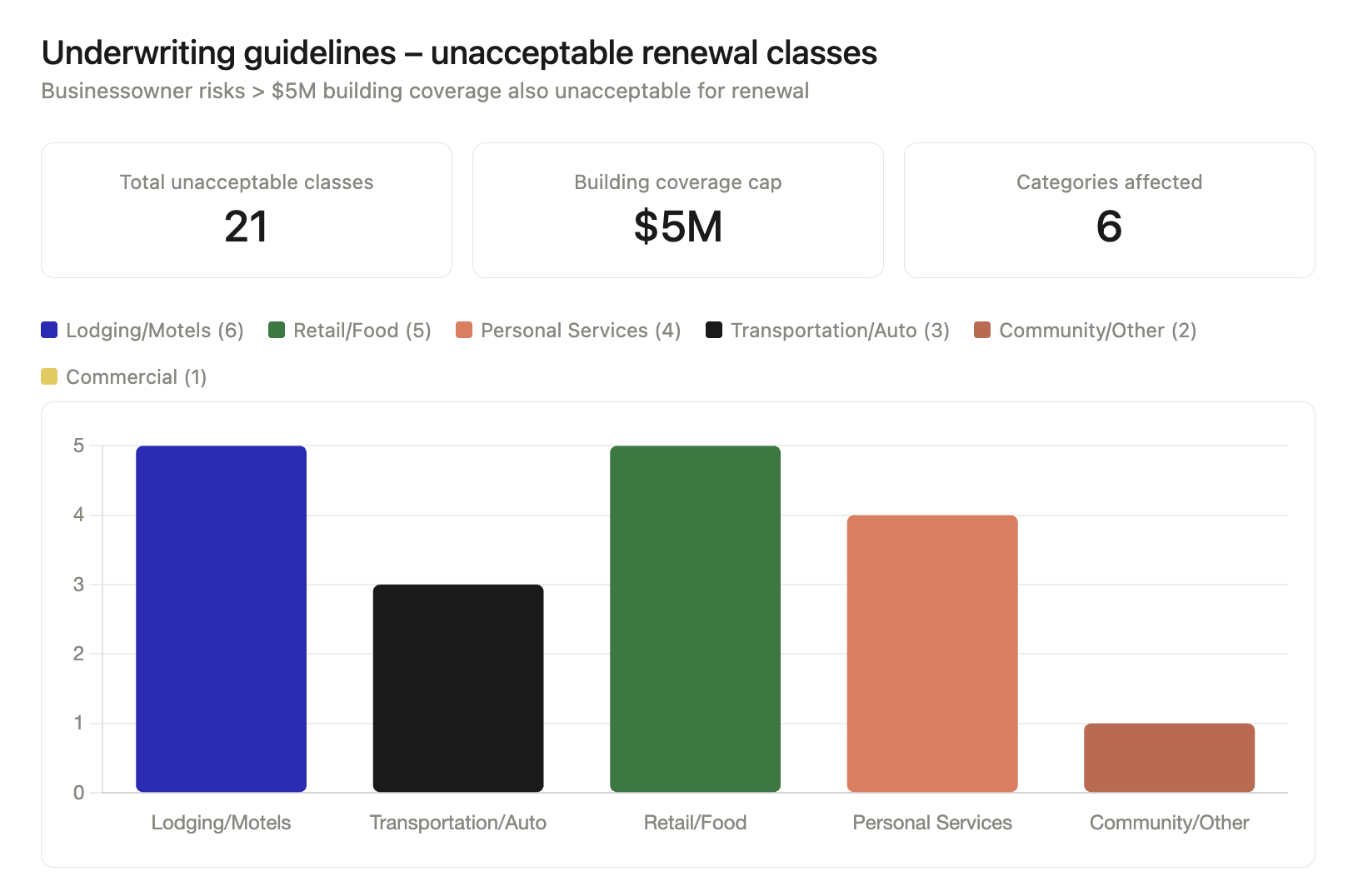 Beyond pricing, the filing introduces tighter underwriting. The company plans to nonrenew several higher risk classes, including motels, convenience stores, and certain service businesses, and will no longer accept risks with building coverage above $5 million.